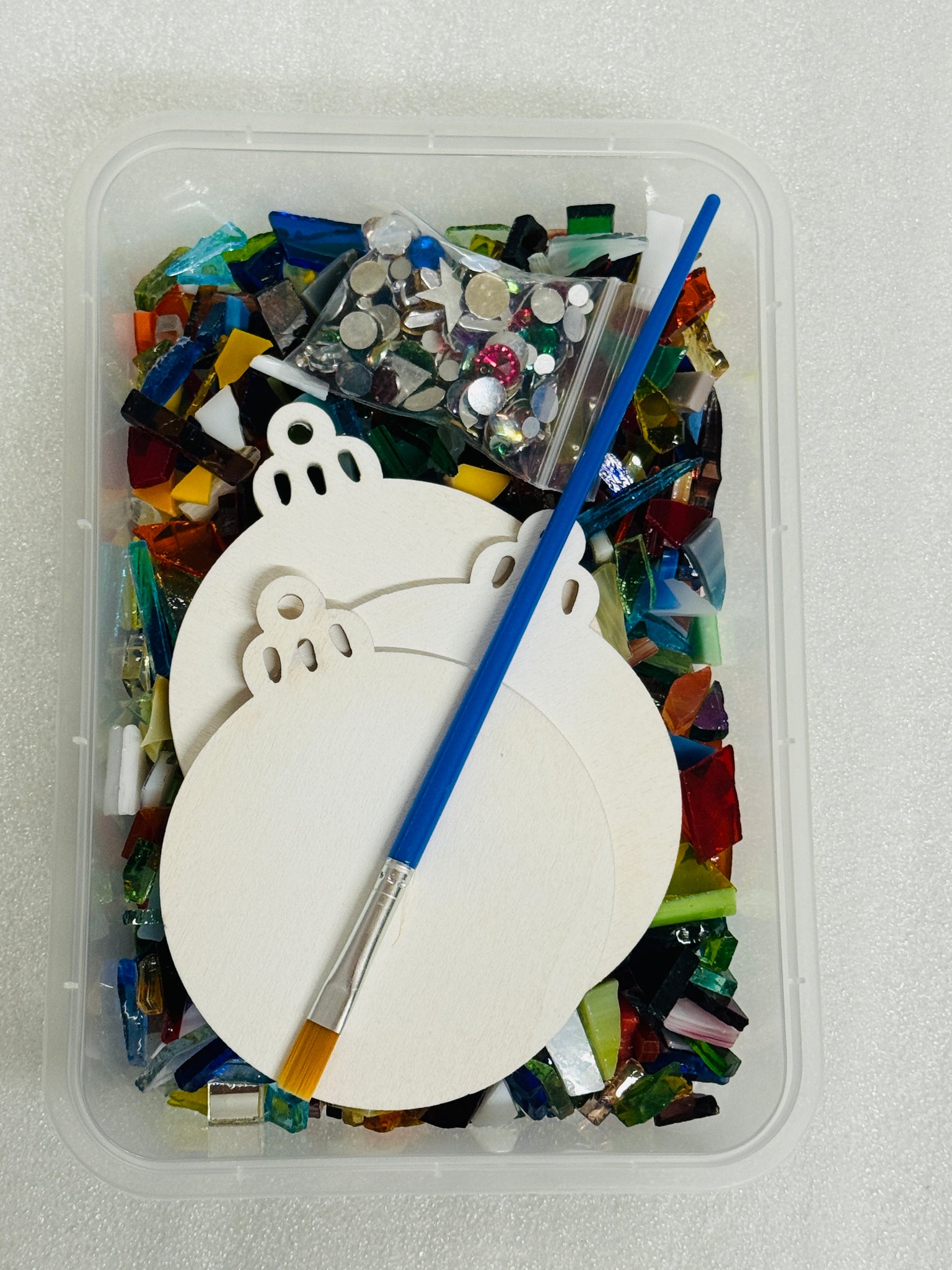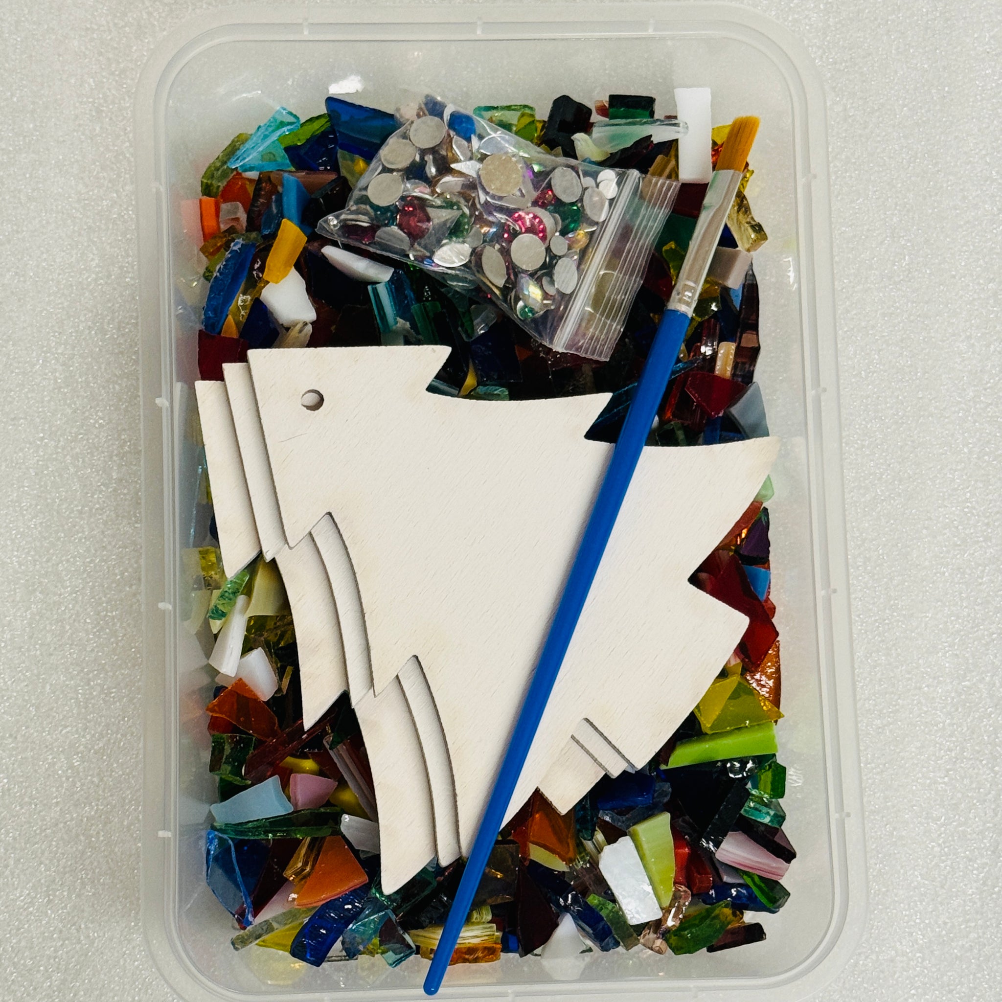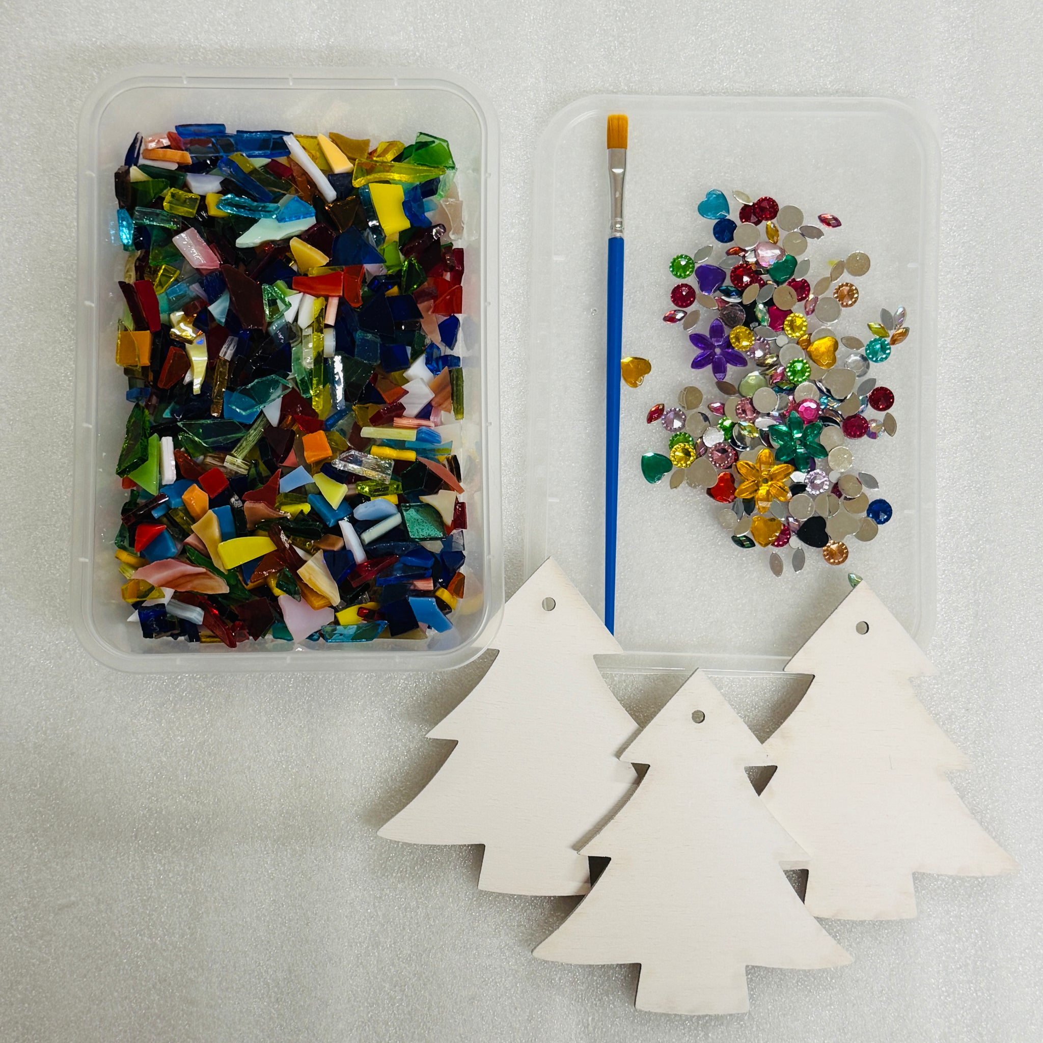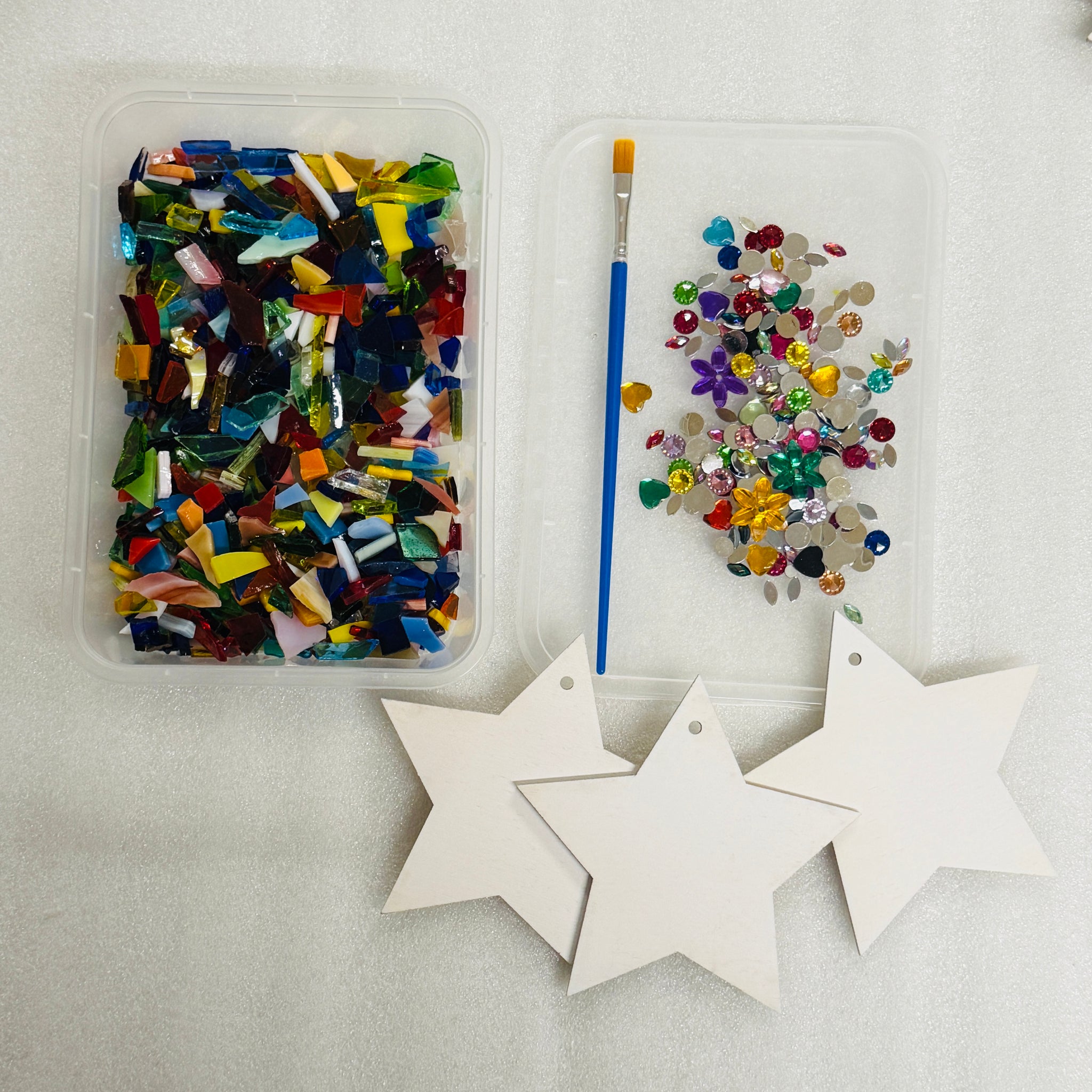 Each kit includes plenty of tumble-mixed coloured glass, a glue brush, and the wooden shapes you’ll need and instructions. The Festive kits also come with a few extra sparkles for that special touch.